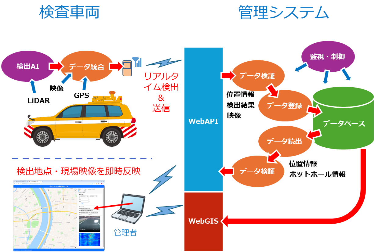 検出したポットホールの位置・サイズと周辺映像を車両からモバイル回線を通じて管理システムへ送信し、Web上の地理情報システム(WebGIS)へリアルタイム表示します
